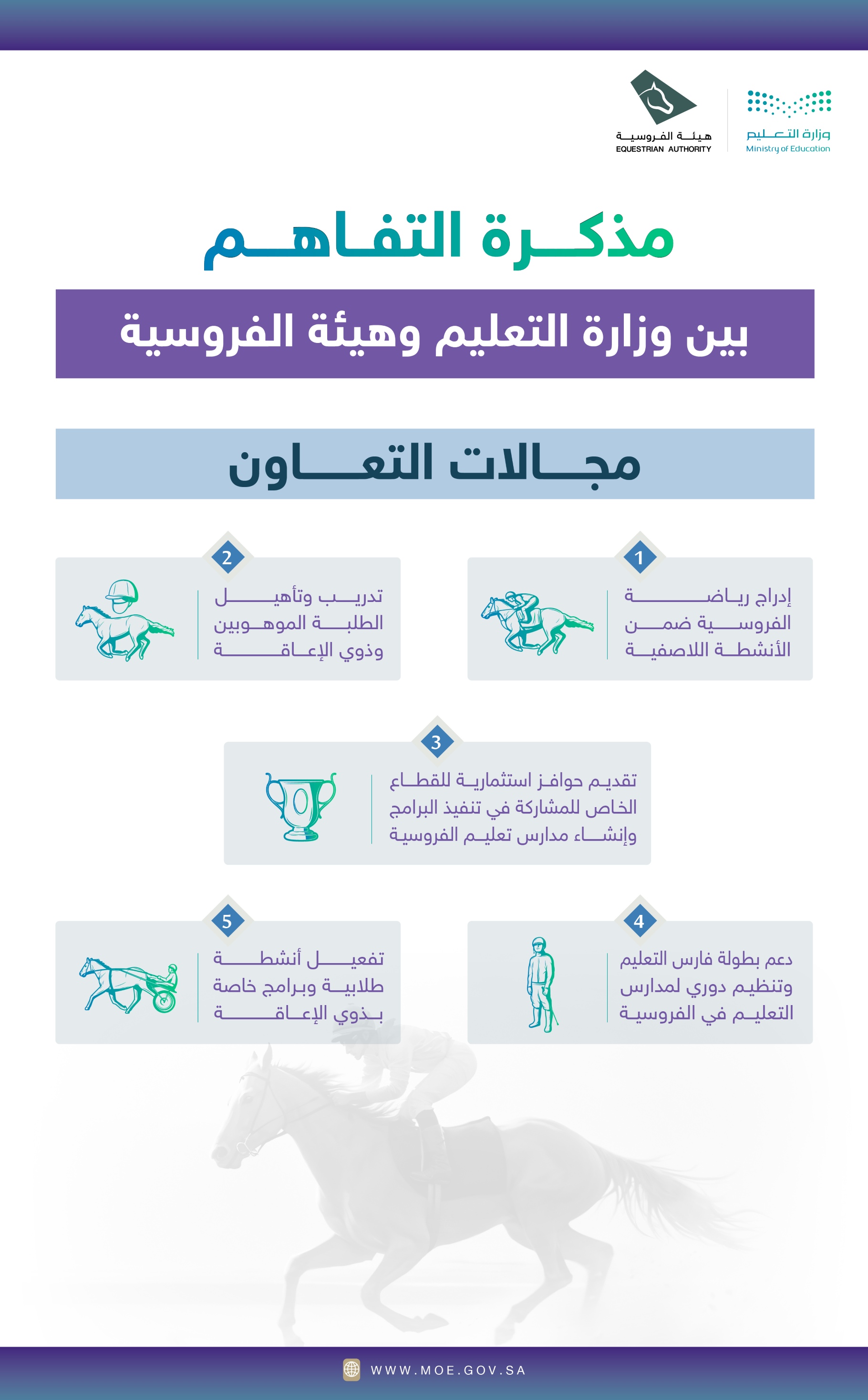 وتهدف مذكرة التفاهم إلى إتاحة الفرص الاستثمارية للقطاعين الخاص وغير الربحي لتطوير مدارس ركوب الخيل، بما يسهم في توفير فرص نوعية لدعم وتنمية مهارات الطلبة في الفروسية، وفتح المجال أمام أفراد المجتمع لممارستها، بما يعزز حضورها المجتمعي ويجعلها أكثر قرباً لكافة الفئات العمرية.