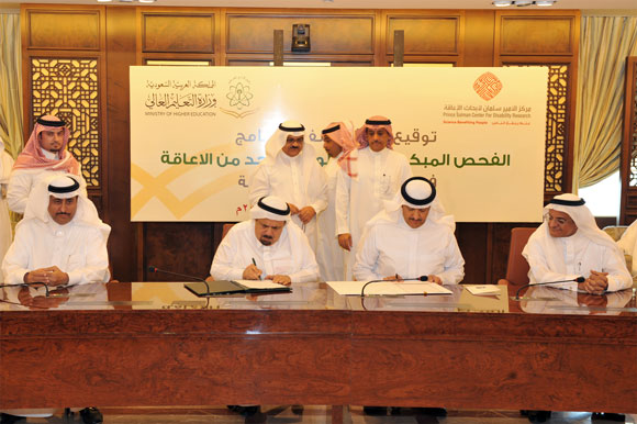 وقع صاحب السمو الملكي الأمير/ سلطان بن سلمان بن عبد العزيز – رئيس مجلس أمناء مركز الأمير سلمان لأبحاث الإعاقة ومعالي الدكتور/ خالد بن محمد العنقري – وزير التعليم العالي، صباح اليوم السبت 25/5/1434هـ الموافق 6/4/2013م ، مذكرة تعاون بين مركز الأمير سلمان لأبحاث الإعاقة ووزارة التعليم العالي ، و ذلك بمقر الوزارة بالرياض.وتهدف مذكرة التعاون إلى تنفيذ "برنامج الكشف المبكر على حديثي الولادة للحد من الإعاقة " في جميع المستشفيات الجامعية القائمة والمستقبلية التابعة لوزارة التعليم العالي من خلال توقيع اتفاقيات بين المركز والجامعات ذات العلاقة لتنفيذ هذا البرنامج ،وذلك انطلاقاً من الإيمان المشترك بأهمية دعم وتنشيط البرامج الوقائية للتقليل من الإصابة بالأمراض الوراثية المسببة للإعاقة، وأخذاً في الاعتبار الإمكانات والقدرات البشرية والتشخيصية المتوفرة بالمركز والمستشفيات الجامعية.وفي هذا الإطار ، تم توقيع اتفاقيات بين مركز الأمير سلمان لأبحاث الإعاقة وكل من جامعة الملك سعود، جامعة الملك عبد العزيز وجامعة الدمام، لتطبيق برنامج الكشف المبكر على حديثي الولادة للحد من الإعاقة للمواليد في المستشفيات الجامعية التابعة لها.وفي تصريح صحفي عقب مراسم التوقيع نوه صاحب السمو الملكي الأمير سلطان بن سلمان بأهمية مذكرة التعاون وقال أنها إضافة للمواطنين ، لأنها تعالج مشاكل الإعاقة وحديثي الولادة خاصة في بعض المناحي التي يغطيها البرنامج ،موضحاً سموه بأن هناك خمسة عشر طبقة من طبقات الفحص وهذه عادت بالفائدة على كثير من الأسر حيث رزقوا بأطفال غير معاقين وأيضاً أنقذت أطفالاً كانوا معرضين للإعاقة ،وهذه الخطوة تعد تاريخية تسجل لمعالي وزير التعليم العالي الدكتور خالد بن محمد العنقري الذي بادر بعد طرح الفكرة عليه بالموافقة والاهتمام ،واليوم نحن نعتز بوزارة التعليم العالي وكوادرها ، واستشهد سموه بسمعة خريجيها دولياً في المجال الطبي على وجه الخصوص حيث قال زرت مركز كليفلند أحد أرقى المراكز الطبية في العالم بالولايات المتحدة الأمريكية وسمعت من منسوبي المركز الإشادة بالأطباء المتخرجين من جامعات المملكة ووصفوهم بالمتميزين ويقبلون التوسع في اختصاصاتهم وهذا فخر لنا كسعوديين .وأشار سمو الأمير سلطان بن سلمان إلى أنه وبعد نجاح البرنامج مع وزارة الصحة ومع وزارة الدفاع أصبح ضرورياً التعاون مع المستشفيات الجامعية .وتنفيذ البرنامج يمر بعدة مراحل والهدف المنشود هو الوصول لجميع المواليد ، وسيكون إجراء هذا الفحص إلزامياً حيث تأخذ عينه من كاحل الطفل حديث الولادة وتفحص بشكل سريع وإذا كان يحتاج تدخل طبي أو غذائي يتم ذلك .هذا ويعتبر برنامج الكشف المبكر على حديثي الولادة للحد من الإعاقة من أهم المشاريع الوطنية التي أطلقها مركز الأمير سلمان لأبحاث الإعاقة عام 2005م ، برعاية كريمة من صاحب السمو الملكي الأمير سلمان بن عبد للعزيز آل سعود ، ولي العهد، نائب رئيس مجلس الوزراء، وزير الدفاع، المؤسس والرئيس الأعلى لمركز الأمير سلمان لأبحاث الإعاقة - حفظه الله - و حضور صاحب السمو الملكي الأمير سلطان بن سلمان بن عبد العزيز آل سعود، رئيس مجلس الأمناء لمركز الأمير سلمان لأبحاث الإعاقة و معالي وزير الصحة، تم من خلاله الإعلان الرسمي لانطلاقة البرنامج الوطني للكشف المبكر على حديثي الولادة.وتعد المملكة العربية السعودية من أكثر الدول التي تعاني من حجم ومستوى الأمراض المسببة للإعاقات المختلفة عند الأطفال حديثي الولادة، حيث بينت الإحصائيات على أن معدل الإصابة بهذه الأمراض هو مولود واحد مصاب لكل ألف مولود (1000:1) مقارنة بالدول الأخرى وهي (4000:1) في أمريكا وأستراليا وألمانيا و (7000:1) في اليابان ، وينتج عن أمراض التمثيل الغذائي الوراثية مضاعفات صحية خطيرة على المولود المصاب، مثل التخلف العقلي، فشل في وظائف الأعضاء، إعاقات جسمانية، أو حتى الوفاة ، كما أن العديد من الحالات المصابة نزلاء دائمون في وحدات العناية المركزة أ