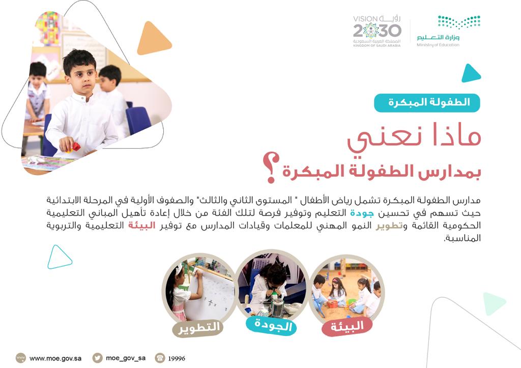 وإدراكاً من وزارة التعليم للاحتياجات المختلفة للمتعلمين الصغار، واستمرارًا لنهج وزارة التعليم في الارتقاء بمستويات الأداء وتطوير الخطط لبناء تشكيل مؤسسي يتناسب مع التأسيس المنشود لدخول الطفل وتهيئته لمراحل التعليم الأعلى وحيث ورد في الدليل التنظيمي للوزارة الصادر بقرار مجلس الوزراء رقم ( 511 ) وتاريخ 2-9-1440 هـ بأن الهدف العام من عمل الإدارة العامة للطفولة المبكرة التابعة لوكالة التعليم العام يرتكز على العمل على توفير خدمات تعليمية مميزة للأطفال ( من سن 3 وحتى الصف الثالث الابتدائي ) ومتابعة أداء مرحلة الطفولة المبكرة وفقاً للمؤشرات المعتمدة لتهيئة الطلبة للالتحاق بالتعليم الأساسي