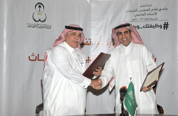 وبعد نهاية الاجتماع وقع معالي وزير التعليم ومعالي وزير الشؤون الاجتماعية اتفاقية لابتعاث 1000 مرشحا ومرشحة ضمن برنامج خادم الحرمين الشريفين للابتعاث الخارجي في مرحلته الثالثة #وظيفتك-وبعثتك، وذلك لشغل وظائف لدى وزارة الشؤون الاجتماعية بعد إكمالهم فترة الابتعاث في تخصصات التنمية الاجتماعية ورعاية المعوقين.