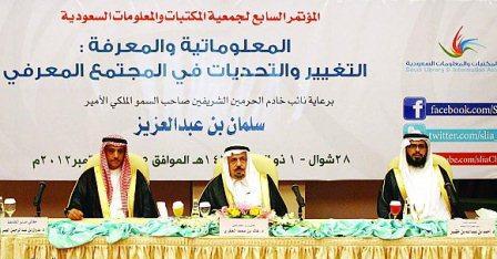 تحت رعاية نائب خادم الحرمين الشريفين صاحب السمو الملكي الأمير سلمان بن عبدالعزيز وزير الدفاع والرئيس الفخري لجمعية المكتبات والمعلومات السعودية، افتتح صباح أمس وزير التعليم العالي الدكتور خالد العنقري المؤتمر السابع للمكتبات والمعلومات السعودية تحت عنوان "المعلوماتية والمعرفة والتغيير والتحديات في المجتمع المعرفي" والذي تنظمه جمعية المكتبات والمعلومات السعودية بجامعة الملك سعود (في الفترة من 28/10: 1/11/1433 ه)، بحضور مدير جامعة الملك سعود الدكتور بدران العمر ووكلاء الجامعة والمشاركين بالمؤتمر.