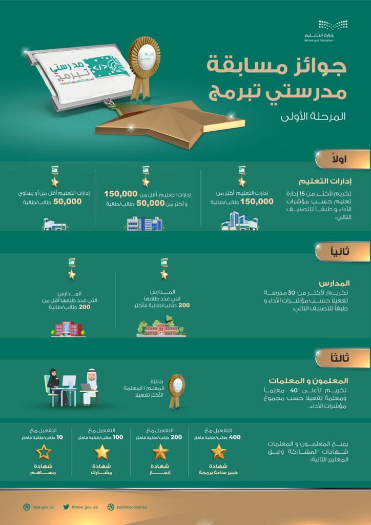 شهدت مسابقة "مدرستي تُبرمج" مشاركة (4,766,205) متسابقين من الطلاب والطالبات والمعلمين والمعلمات وأولياء الأمور ومنسوبي التعليم؛ وأفراد المجتمع منذ انطلاقتها في بداية شهر شعبان الماضي وحتى نهاية المرحلة الأولى في 17 رمضان.