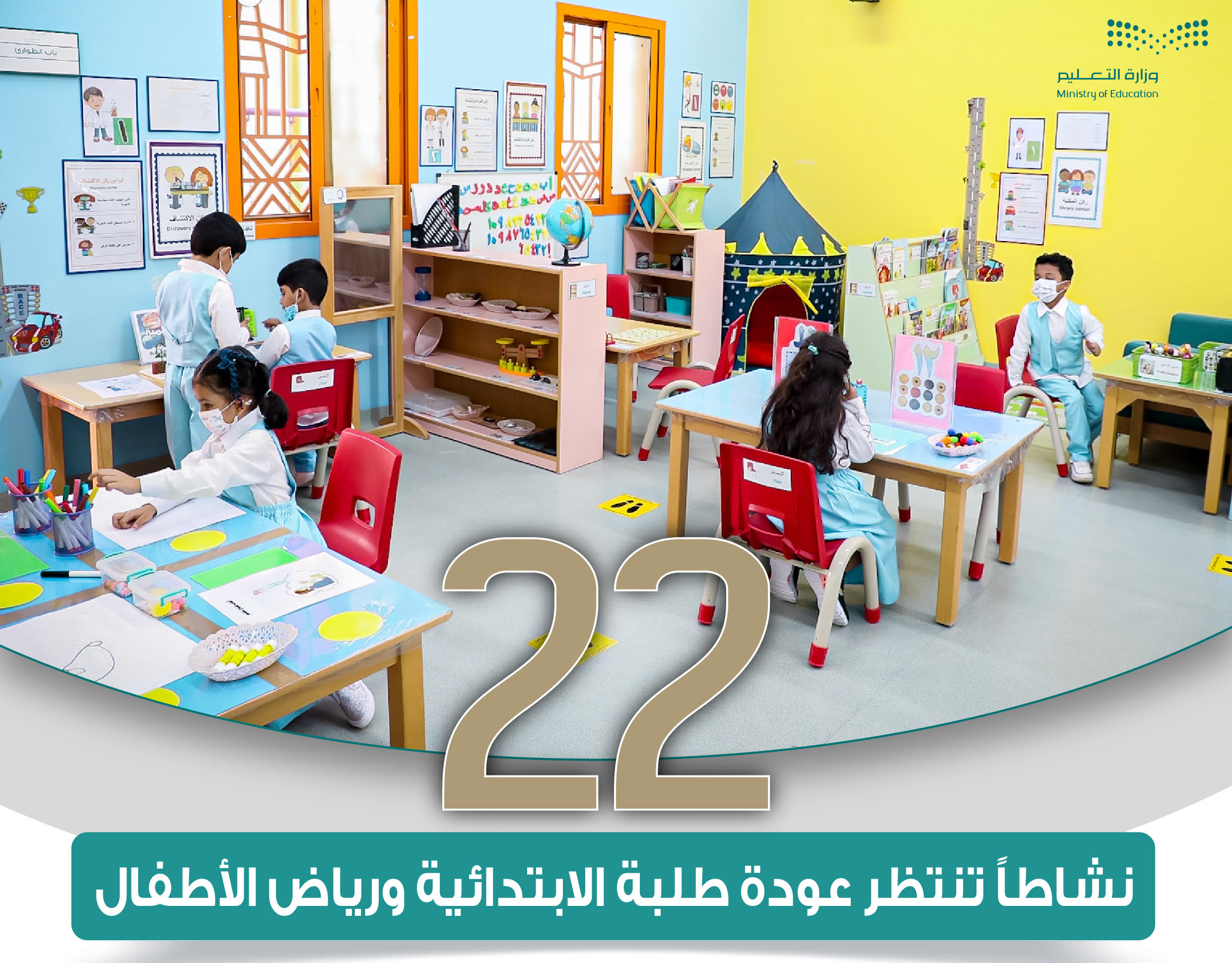 تنفذ إدارات التعليم بمناطق ومحافظات المملكة حزمةً من البرامج والأنشطة ضمن برنامج التهيئة للعودة الحضورية الآمنة للمرحلتين الابتدائية ورياض الأطفال في 23 يناير، مشتملةً على 22 نشاطاً ثقافياً وترفيهياً وتوعوياً؛ موجهاً إلى طلبة الابتدائية ورياض الأطفال، تعمل على تهيئتهم وتحفيزهم للعودة إلى مقاعد الدراسة، وصولاً إلى تحقيق تكيّفهم الاجتماعي واندماجهم في صفوفهم الدراسية.