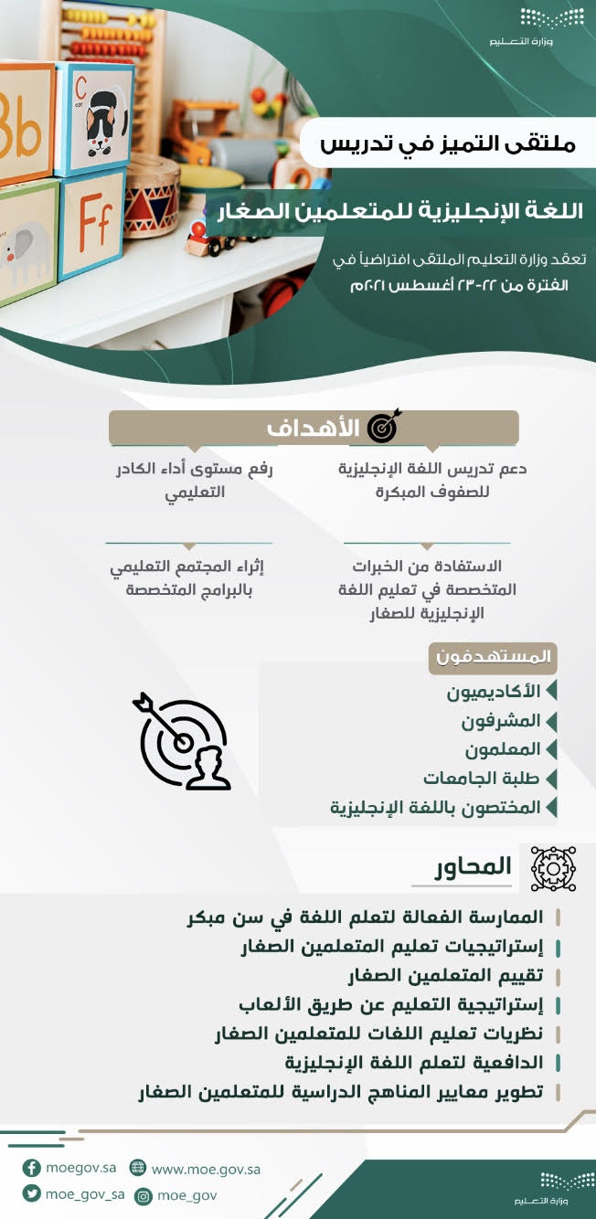 وزارة التعليم تنظم ملتقى "التميّز في تعليم اللغة الإنجليزية للمتعلمين الصغار" بمشاركة خبراء من أمريكا وبريطانيا واليونان وجامعات سعودية