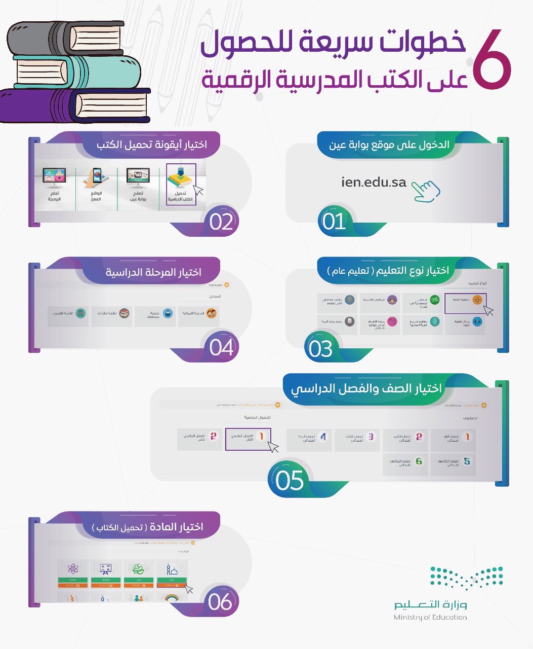أتاحت وزارة التعليم جميع المقررات والكتب المدرسية الرقميةعبر موقع بوابة عين ien.edu.sa لتكون في متناول أبناءها الطلاب والطالبات، وذلك ب(6) خطوات سريعة تبدأ بالدخول للبوابة ، واختيار أيقونة تحميل الكتب ، واختيار نوع التعليم ( تعليم عام) والمرحلة الدراسية ، والصف والفصل الدراسي، والمادة ومن ثم تحميل الكتاب على الأجهزة اللوحية وأجهزة الكمبيوتر والهواتف الذكية .