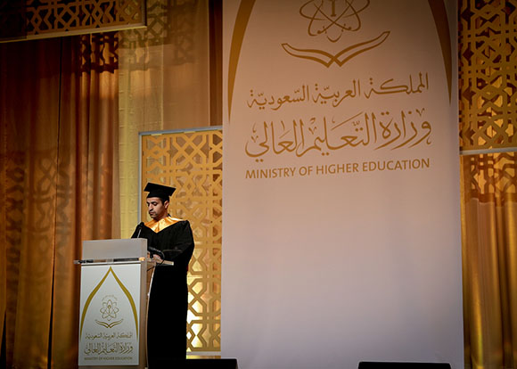 خريج مرحلة الدكتوراة في تخصص القانون سالم العلياني ألقى كلمة الخريجين مبتدئاً إياها بأبيات للأديب الراحل الدكتور غازي القصيبي – رحمه الله - وقال في كلمته " معجزة هي تلك، التي ترفع المباني الشاهقة في قلب الصحراء. معجزة هي تلك، التي تبعث الحضارة المطمورة تحت كثبان الرمال. معجزة هي تلك، التي تحيل الأرض القاحلة إلى خضراء مُعشبة. معجزة هي تلك، التي تحيل الدولة الفتية، إلى أمة تزاحم الأمم العظمى. معجزة هي تلك، اسمها: المملكة العربية السعودية.