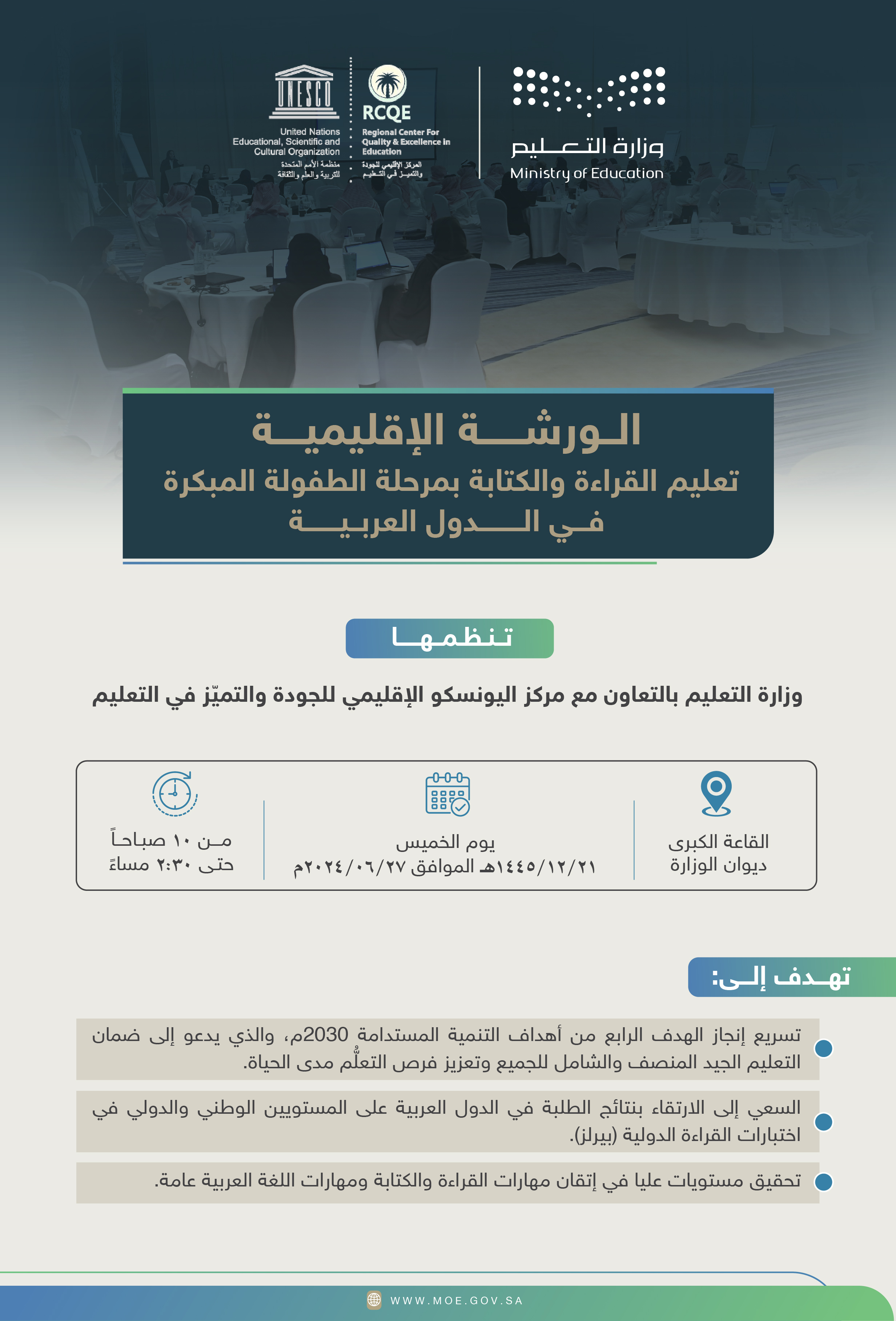 برعاية وحضور معالي وزير التعليم الأستاذ يوسف بن عبدالله البنيان، رئيس مجلس إدارة مركز اليونسكو الإقليمي للجودة والتميّز في التعليم، تنظّم وزارة التعليم، وبالتعاون مع مركز اليونسكو الإقليمي للجودة والتميّز في التعليم يوم الخميس 21 ذو الحجة لعام 1445 هـ الموافق 27/ 6/ 2024م ورشة إقليمية بعنوان: "تعليم القراءة والكتابة بمرحلة الطفولة المبكرة في الدول العربية"؛ بهدف التعرّف على واقع تعليم وتعلُّم مهارتي القراءة والكتابة باللغة العربية في مرحلة الطفولة المبكرة لرياض الأطفال والصفوف الثلاثة الأولية في المرحلة الابتدائية في عدد من الدول العربية، وتسريع إنجاز الهدف الرابع من أهداف التنمية المستدامة 2030م، والذي يدعو إلى ضمان التعليم الجيد المنصف والشامل للجميع، وتعزيز فرص التعلُّم مدى الحياة.
