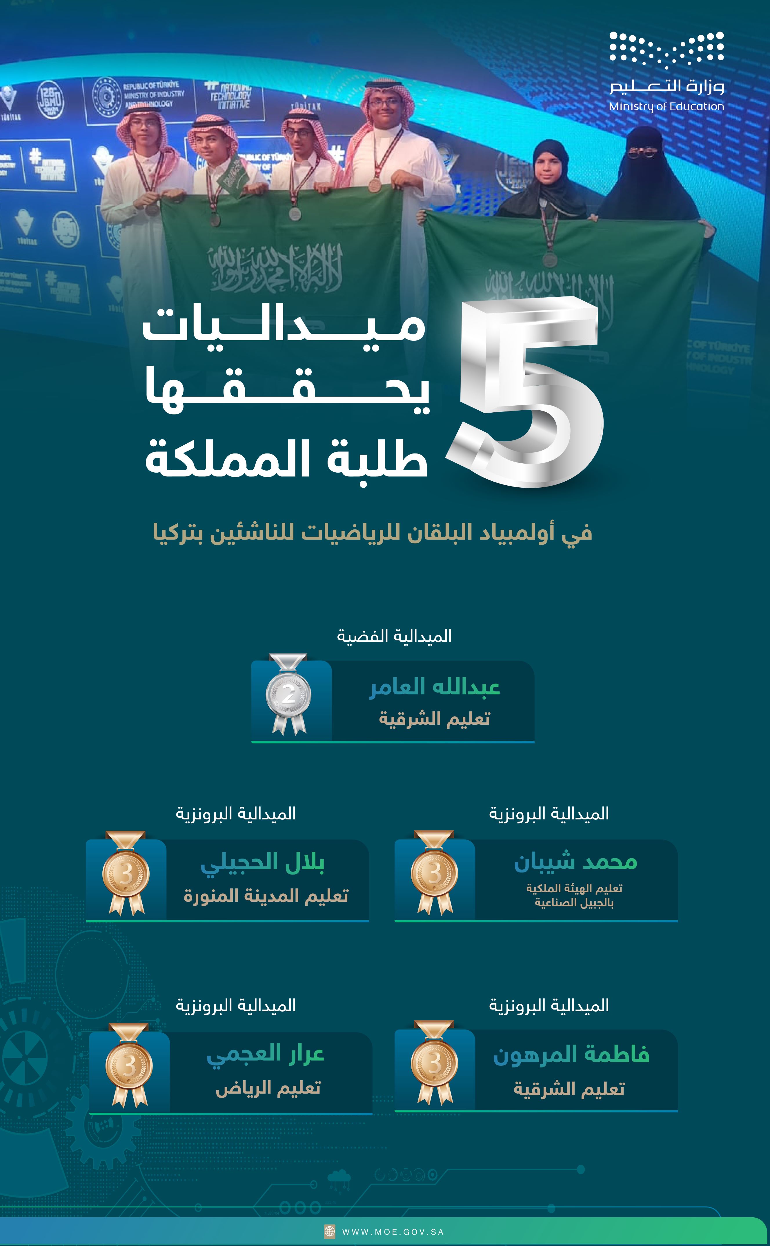 وحصد طلبة المملكة 5 ميداليات؛ ميدالية فضية وأربع ميداليات برونزية، حيث حصل عبدالله العامر من تعليم الشرقية على الميدالية الفضية، وفاز بالميداليات البرونزية كل من: محمد شيبان من تعليم الهيئة الملكية بالجبيل الصناعية، بلال الحجيلي من تعليم المدينة المنورة، فاطمة المرهون من تعليم الشرقية، وعرار العجمي من تعليم الرياض.
