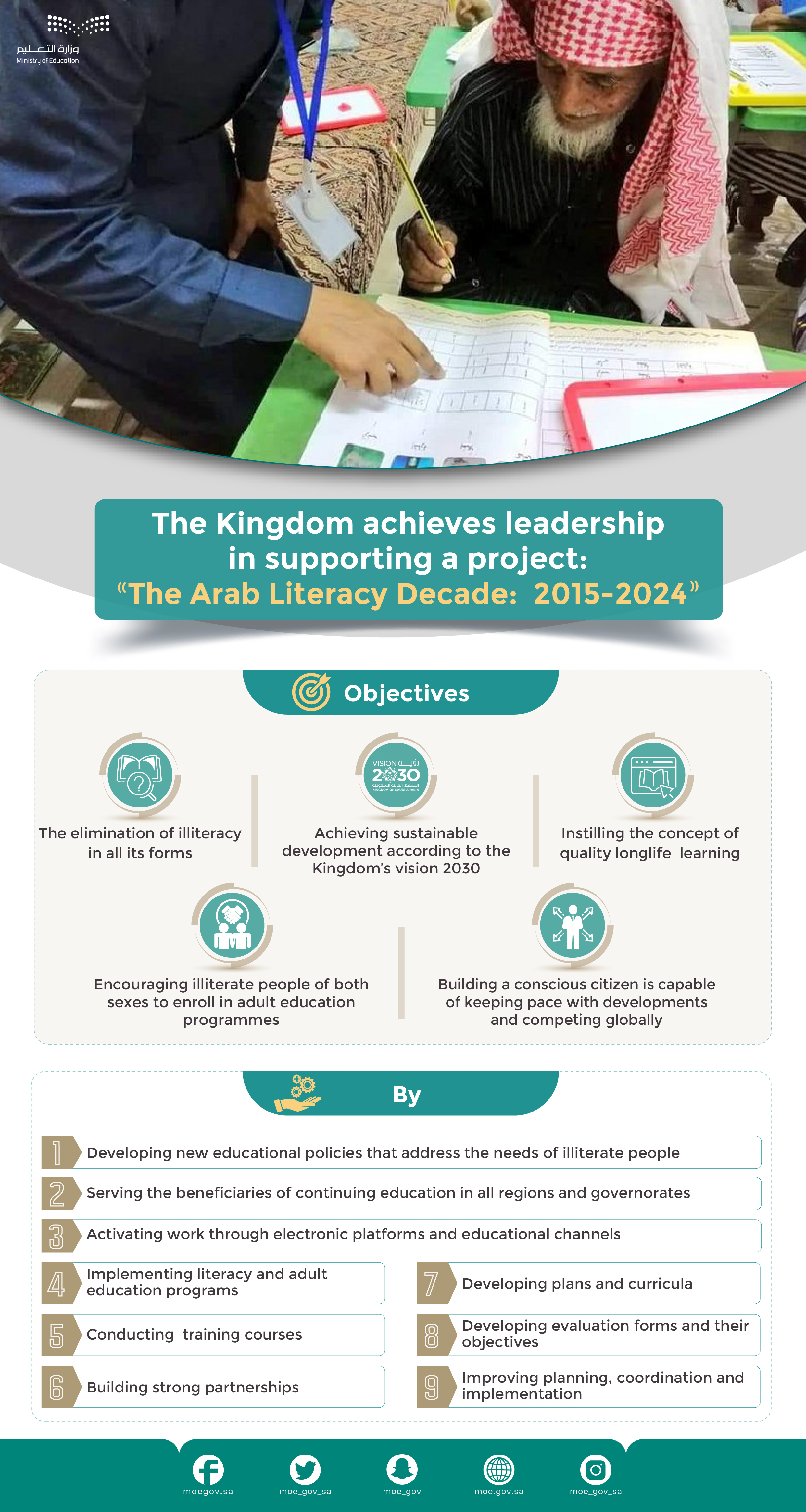 Selectively focused campaigns for a period of two months are held in places where it is difficult to prepare for regular classes. These campaigns are one of the educational programs that target a group of citizens in their places of residence in cities and villages to eradicate their illiteracy with the participation of bodies and entities from the government sector, the private sector, and the third sector under the supervision of the Ministry of Education. This is done with the goal of eradicating illiteracy and teaching the target audience the fundamentals of literacy, as well as raising religious, cultural, social, and health awareness among the target audience and strengthening their sense of national belonging.